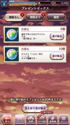 ホーム画面のプレゼントボックスから「事前登録キャンペーン」や本編で手に入れた月華石を回収します。
