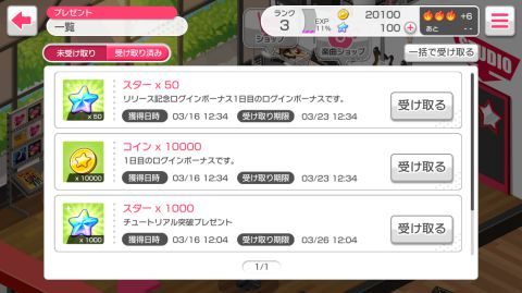 まずはホーム画面右のプレゼントから「チュートリアルクリア」などのスターを受け取ります。
