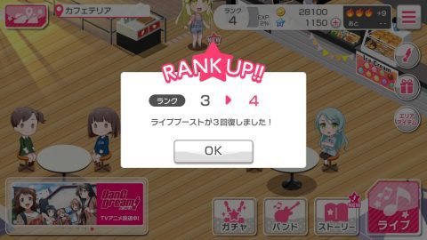 - 「CiRCLE」と「カフェテリア」にいる「NEW」のキャラクターと会話して経験値を獲得し、ランクを4、Poppin’ Partyのバンドランクを2まで上げる。