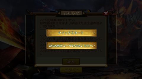 次にログイン方法を「クイックスタート」と「GSGAMESアカウント」から選択します。