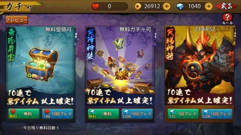 右が「神将ガチャ」で真ん中が「装備ガチャ」です。
