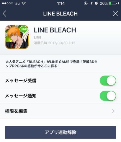 次にLINEアプリを立ち上げて右上の歯車アイコンから設定⇒アカウント⇒連動アプリ⇒LINE BLEACHを選択して「アプリ連動解除」を行います。