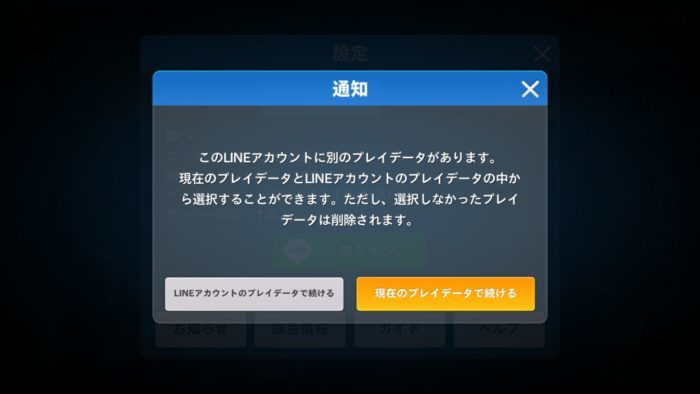 リセマラ2周目以降であれば「LINEアカウントのプレイデータ」と「現在のプレイデータ」を尋ねられますが、「LINEアカウントのプレイデータ」を選ぶと現在のプレイデータが消えてしまうので、必ず「現在のプレイデータ」を選びましょう。