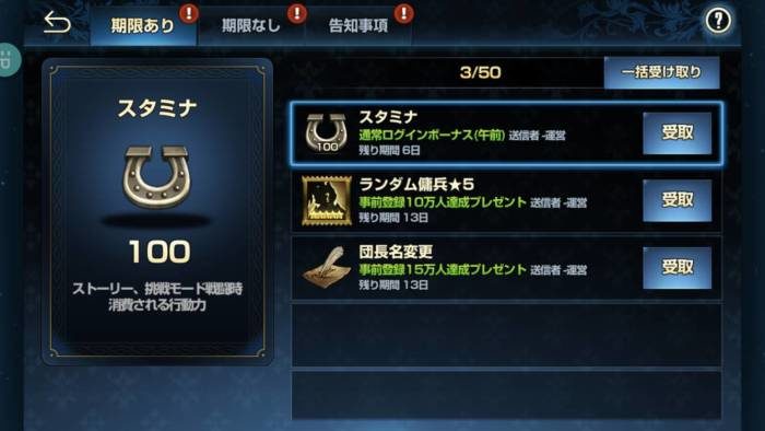 画面左上からホームに戻って、ヘッダーのメールアイコンから事前登録報酬のダイヤやランダム星5傭兵を受け取ります。