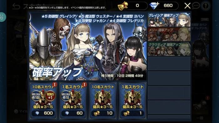 3/10時点では攻撃型、防御型、魔法型の3つのピックアップガチャが開催されていました。