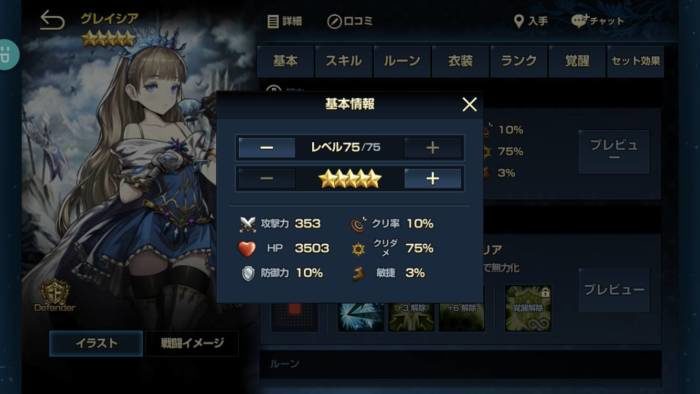 ブラダスでは図鑑メニューから未所持のキャラクターのステータスやスキルをレベルアップ、昇格、覚醒を含めて確認することができます。