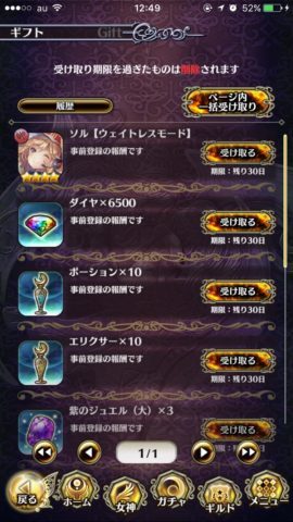 自由に動けるようになったらホーム画面右のギフトから「ログインボーナス」や「事前登録報酬」のダイヤを回収します。