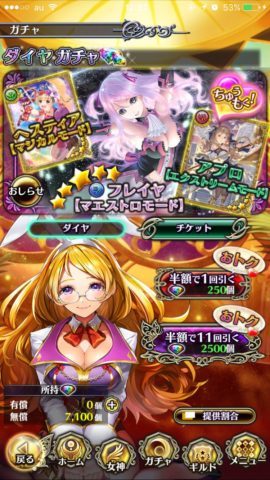 ダイヤガチャは通常1回ダイヤ500個、11連でダイヤ5000個ですが、初回に限り単発はダイヤ250個、11連ガチャはダイヤ2500個と半額のダイヤで引くことができます。