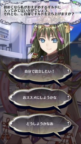チュートリアル中にギルドを「自分で設立する」か「おすすめギルドに加入する」かを選びます。