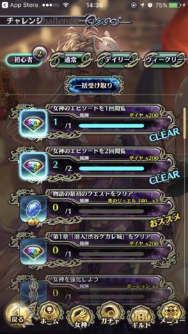 初心者チャレンジは「女神のエピソードを1回閲覧」、「女神のエピソードを2回閲覧」がすぐに達成できるのでおすすめです。