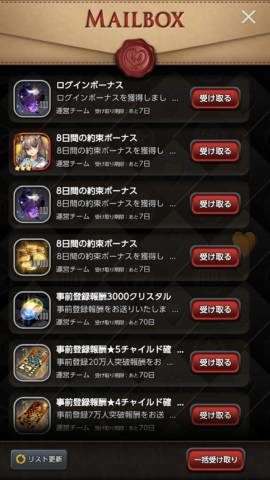 チュートリアルが終わり自由に操作できるようになったらホーム画面右上のメールBOXから事前登録報酬のクリスタルと星4チャイルド確定チケット、星5チャイルド確定チケットを受け取ります。
