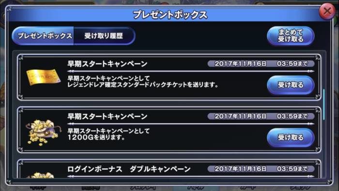 12/1(金)3:59までは早期スタートキャンペーンとしてレジェンドレア確定チケットと1200Gがもらえるので、それまでにリセマラを終わらせておきましょう。