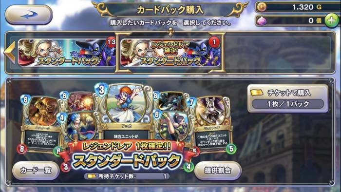 手持ちのチケットでカードパックを購入し、レジェンドレアを目指します。