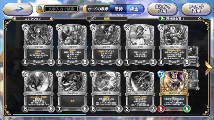 フッターのカード⇒カード一覧でカードの表示を「錬金」とすると、まだ持っていないカードのステータスも含めて全カードのステータスを確認できます。