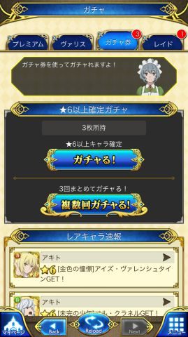 最後に「ガチャ券」のタブから星6以上確定ガチャを3回引きます。