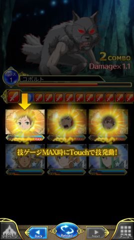 もう一度ダンジョンをポチポチ進むとまたレイドボスが出現するので、技の説明を受けつつ倒します。