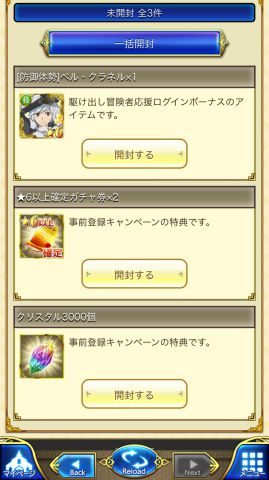 ホーム画面右上のギフトから事前登録キャンペーンの特典の「星6以上確定ガチャ券」と「クリスタル」を受け取ります。