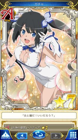ガチャの演出は「登場するキャラクターの数(2人<3人<4人)」、「押せ!ボタン」、「ヘスティアカットイン」、「ヘスティア群」、「金色」(星6確定)、「虹色」(星7確定)などを確認しており、かなり多彩になっています。
