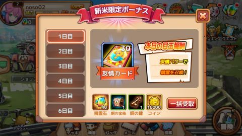 画面上の「ログイン」から「友情カード」を30枚もらえるので、受け取ります。
