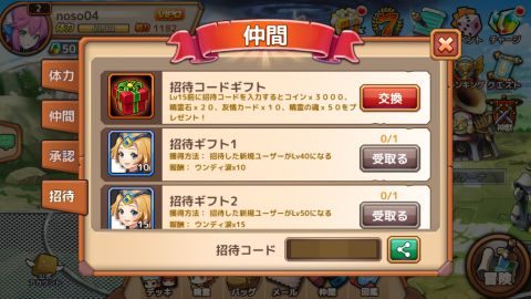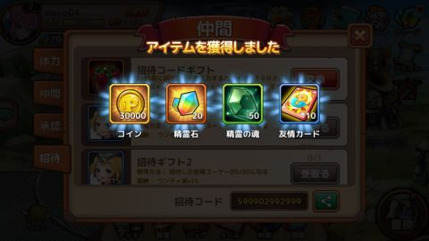Lv15までにだれかの招待コードを入力すると、「コイン」、「精霊石」、「友情カード」、「精霊の魂」をもらえます。