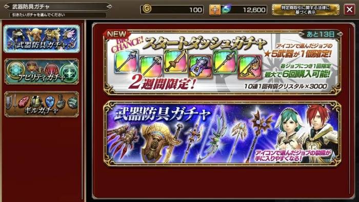 クリスタルを消費するガチャには武器防具ガチャとアビリティガチャの2種類があります。スタートダッシュガチャは有償クリスタル限定なのでリセマラでは引けません。