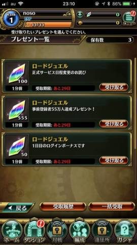 画面右上のメニュー⇒プレゼントから事前登録やログインボーナスなどのロードジュエルを受け取ります。