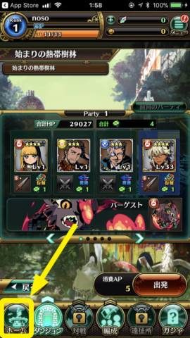 パーティ編成と装備が終わった後に強制的にクエストに誘導されますが、クエスト開始前にホーム画面に戻ることができます。
