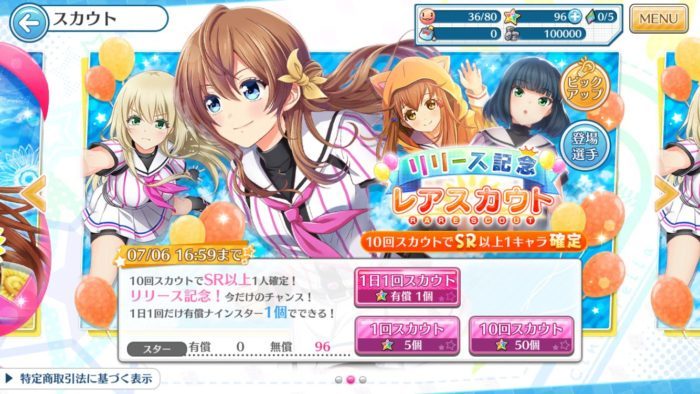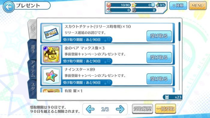 6/27時点では事前登録キャンペーン、リリース遅延のお詫び、ログインボーナスなどでこの時点でナインスターが96個とスカウトチケットが10枚になりました。