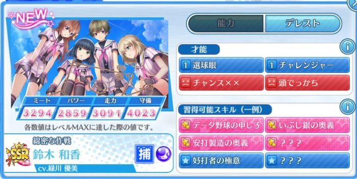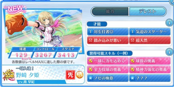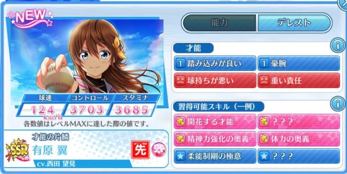 チュートリアルのスカウトは進行上、SRピッチャー(投手)が確定しています。