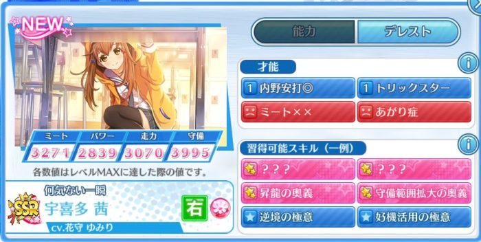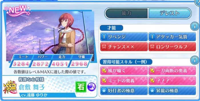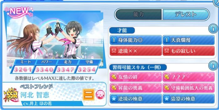 SSR選手のステータスと才能、習得可能なスキルは以下の通りです。