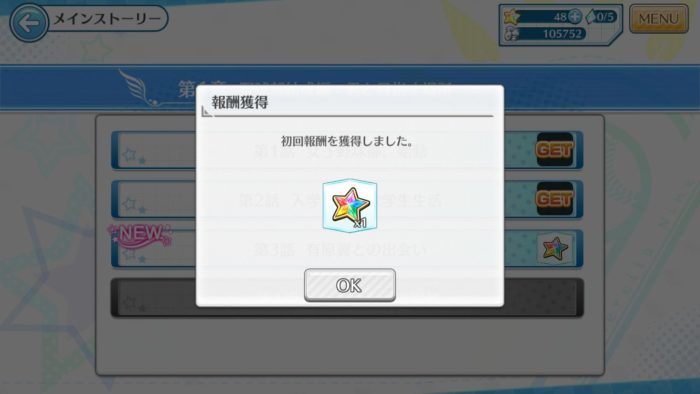 デレ戦を2回プレイしてエールを7000まで貯め、メインストーリーを1章3話まで読むことでナインスターが50個貯まりました。