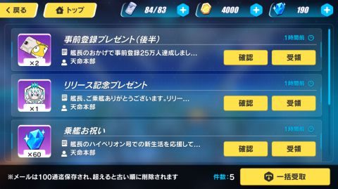 ホーム画面の「メール」から「事前登録プレゼント」、「リリース記念プレゼント」などで水晶や補給チケットなどの報酬を受け取ります。(3/16まで