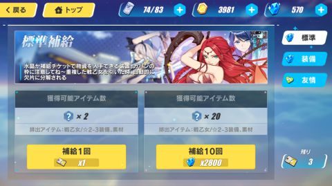 補給はガチャのことで、水晶を使う補給には「標準補給」と「装備補給」があります。