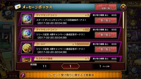 ▲メッセージボックスでダイヤモンドコインを受け取ります。