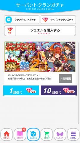 サーバントクランガチャは単発でジュエル25個、10連でジュエル250個でSRが1体以上確定し、ランダムで16種類のコスチュームから一つが手に入ります。