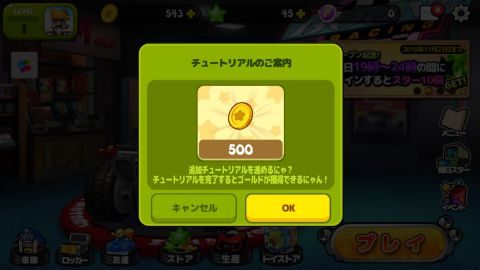 カート変更や性能強化などの追加チュートリアルがあり、クリアすると500コインもらえます。