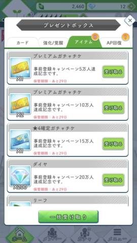 チュートリアルが終わり自由に動けるようになったら、ホーム右上のプレゼントボックスから事前登録特典やログインボーナスでもらえるダイヤ、ガチャチケットを回収します。