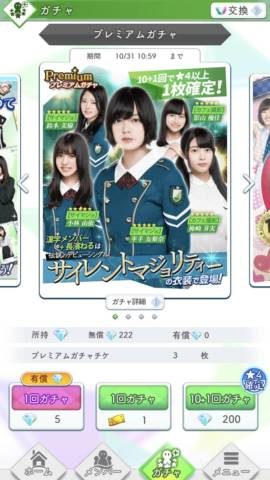 10/18時点でガチャから出現する星5カードの衣装には2種類あり、欅坂46(漢字欅)のメンバー(長濱ねる含む)には「サイレントマジョリティー」の衣装が、けやき坂46(ひらがなけやき)のメンバーには「カフェ撮影」の衣装が用意されていました。