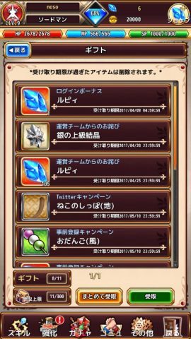 ゲーム内下部の「メニュー」⇒「ホーム」⇒「ギフト」に「事前登録キャンペーン」や「お詫び」のルピィが届いているので受け取ります。