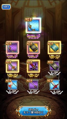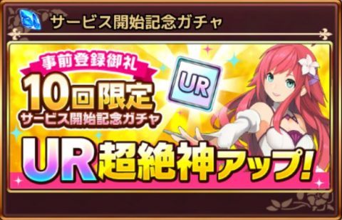 サービス開始記念ガチャから出現するのは武器のみで、最高レアリティのUR装備の出現率が通常のガチャに比べて3倍以上の20.23%となっており、10回だけ引くことが可能です。