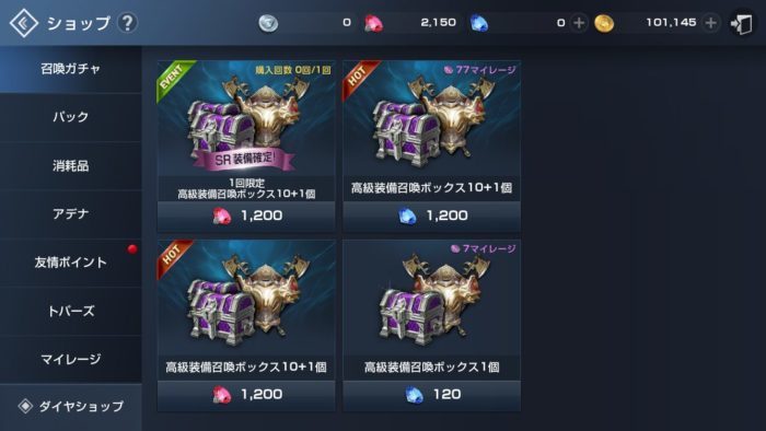レッドダイヤで購入する「高級装備品召喚ボックス10+1個」はゲーム開始直後から解放されていますが、単品の「高級装備品召喚ボックス」はメインクエスト1-6で解放されます。