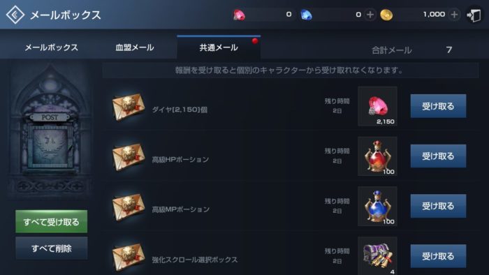 キャラクター作成直後に画面上部のメールアイコンからメールボックスを開き「共通メール」から事前登録報酬のレッドダイヤを受け取ります。