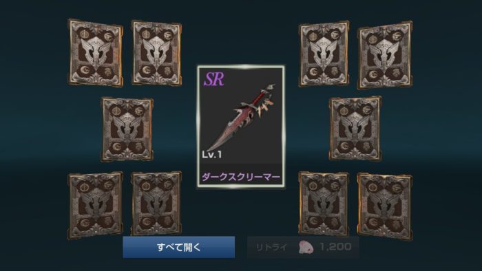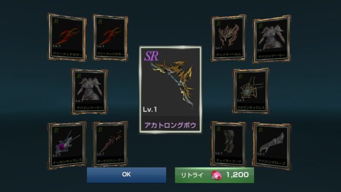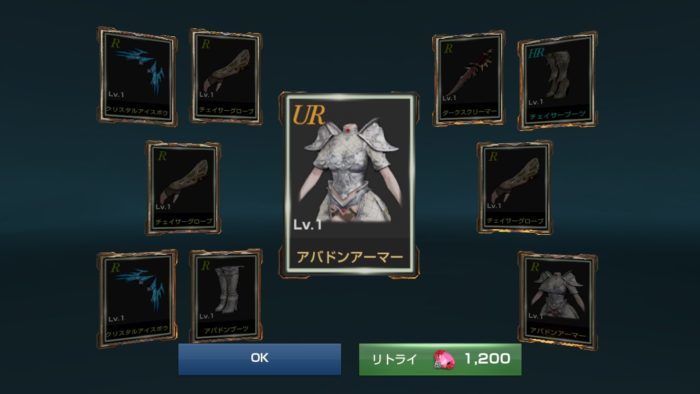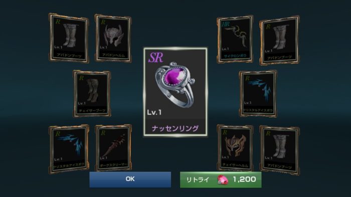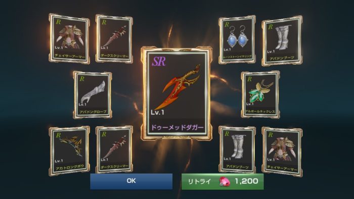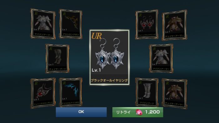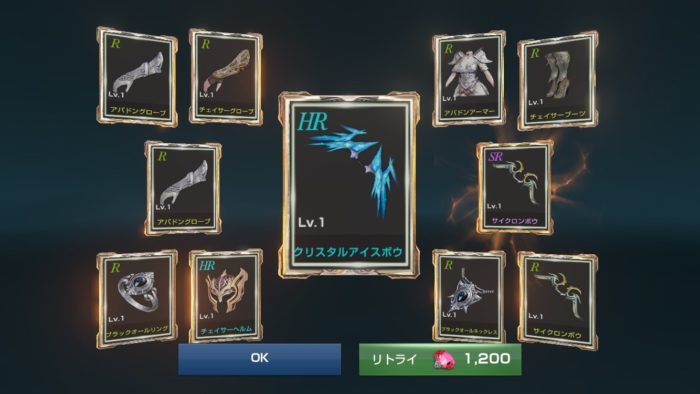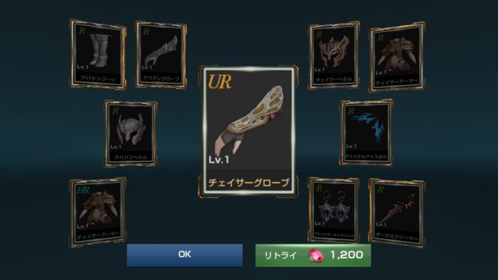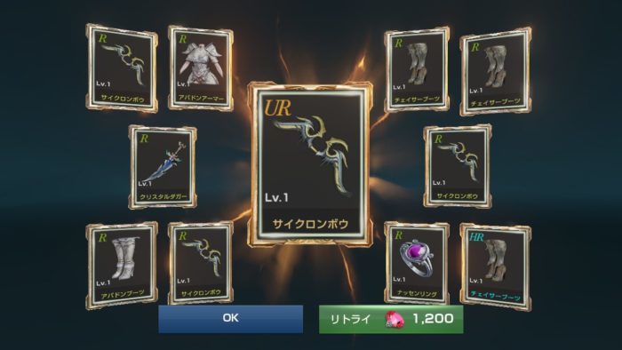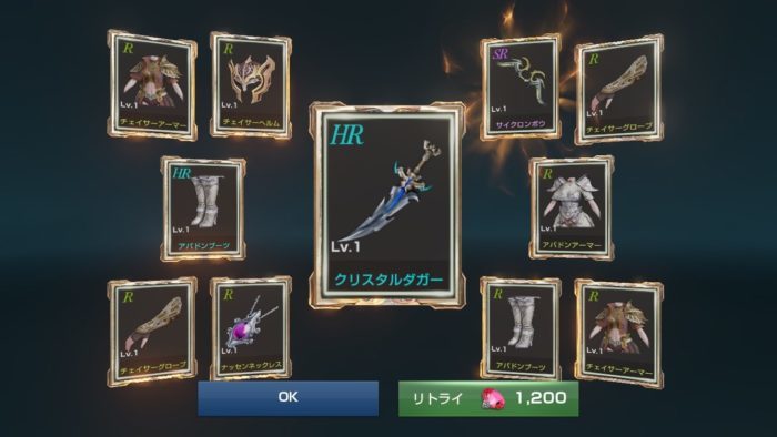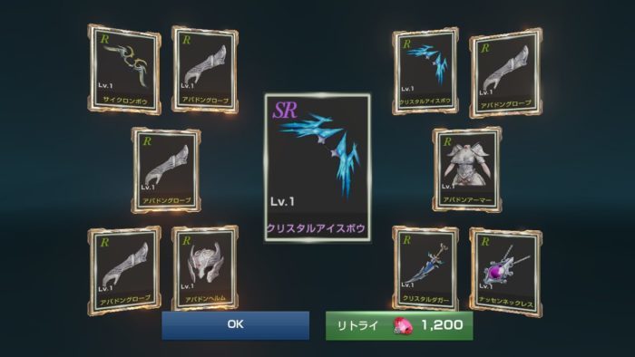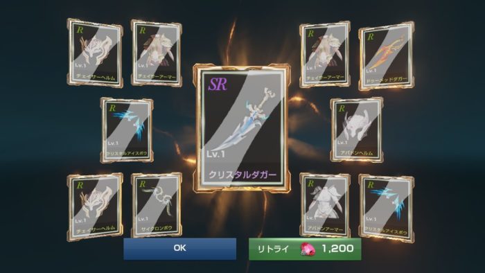 金色のクリスタルが出現したときはUR装備、紫のクリスタルでSR装備が出現しました。
