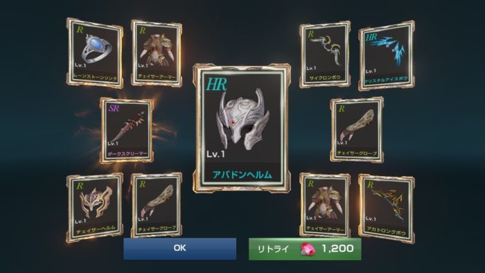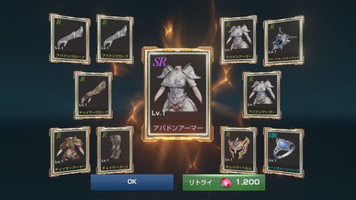R装備10個、HRは確定分1個のみ、SR、UR装備なしの場合がほとんどでHR以上の確率はかなり低そうです。