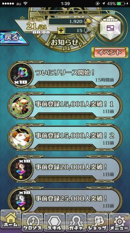 ホーム画面右上のお知らせから事前登録の報酬の虹まきを回収します。