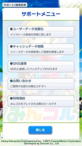 メニュー⇒タイトルでタイトル画面に戻り、左上の「サポート/機種変更」から「ユーザーデータ初期化」を選択することで、データのリセットが可能です。