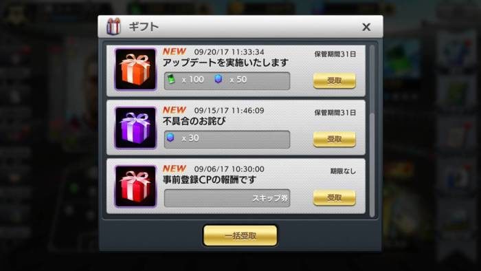 チュートリアルが終わり、自由に動けるようになったらホーム画面左のギフトから事前登録や補てんなどのダイヤ、スカウトチケットを受け取ります。