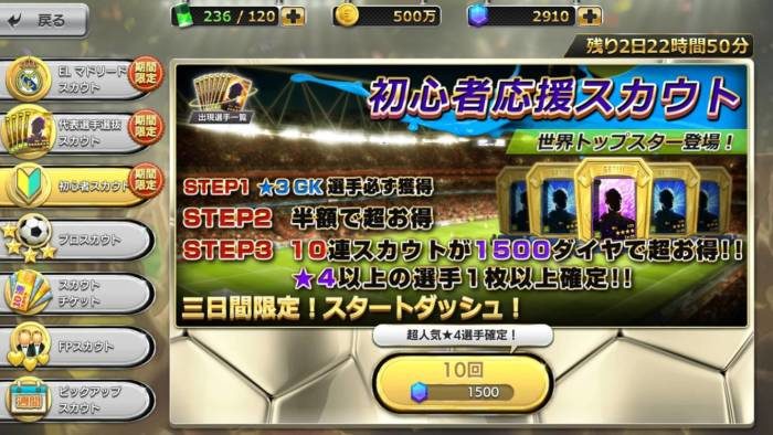 この時点で星4(SS)以上の選手が10人以上手に入っていれば、ミッションで10連スカウトチケットが手に入るので確認しておきましょう。