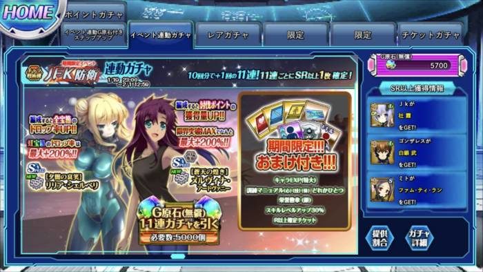 1/29時点ではリリース遅延のお詫びもあって、この段階でG原石が5700個、SSR確定ガチャチケットが2枚になりました。
