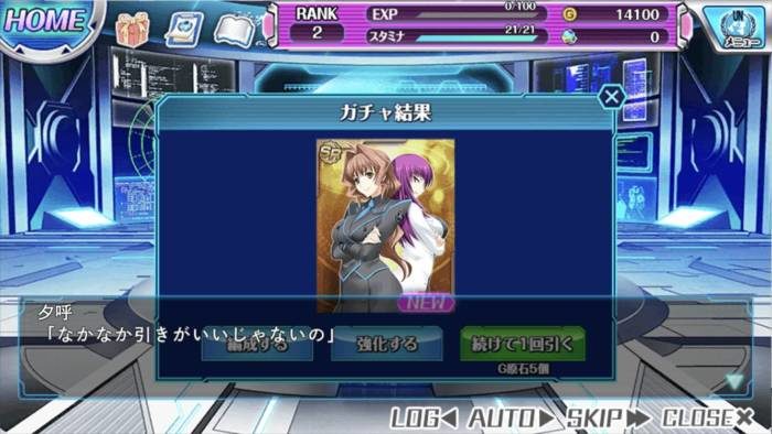 チュートリアルではガチャでSRキャラの「神宮司まりも」が手に入りますが、チュートリアルをスキップした場合も手に入るので、一度見たらスキップ推奨です。